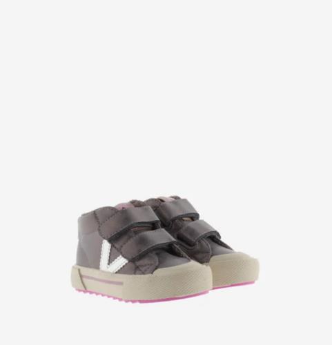 Botines zapatilla VICTORIA elaborados en material metalizado efecto piel con detalles espejo en el logo y la parte trasera. Etiqueta con print de flor en la lengüeta. Destacan por un detalle en forma de flor en la etiqueta de la lengüeta. Su cierre mediante tiras adherentes asegura un calce cómodo y una sujeción óptima del pie. La suela de goma incluye refuerzo en la puntera y un patín antideslizante de color flúor, garantizando seguridad y estilo. Además, incluyen una plantilla estampada de alta densidad que proporciona un confort excepcional. Perfectas para acompañar el ritmo activo de los más pequeños con estilo y comodidad.