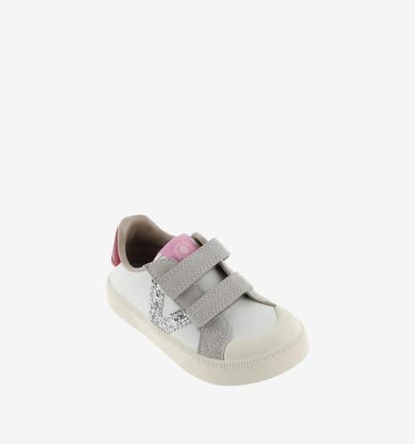 Zapatillas deportivas barefoot para niños fabricadas en material efecto piel. V del lateral en glitter (en color plata) y detalle de color en pieza trasera. Cierre mediante dos tiras adherentes, tres a partir de la talla 36, que facilitan el calce y aportan sujección. Suela de goma ligeramente tostada. Te recomendamos elegir una talla menos de la habitual, ya que el calzado barefoot cuenta con una horma ancha y un calce más amplio.