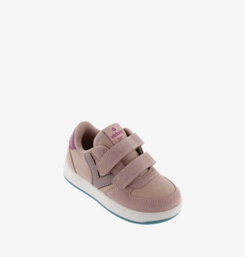 Zapatillas VICTORIA rosas nude fabricadas en material efecto piel y serraje. V retro en el lateral y detalle fucsia en la trasera. Suela bicolor azul y cierre mediante dos tiras adherentes, ( tres a partir de la talla 36 ) para favorecer el calce y la autonomía de los más pequeños. Llevan un perforado en el empeine para favorecer la transpiración.