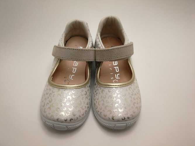 mercedes ZAPY con cierre de velcro, en color platino. Interior de piel, con plantilla de cuero especial para el sudor. Estampado de lunas metalizado en platino, ¡muy fáciles de combinar! Con puntera y talón reforzado.