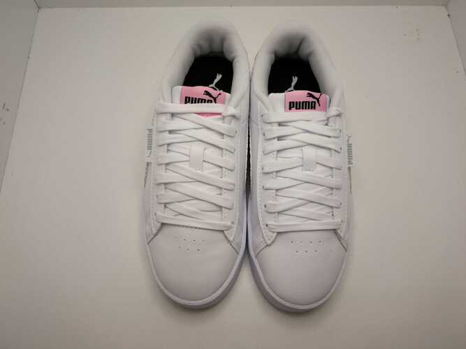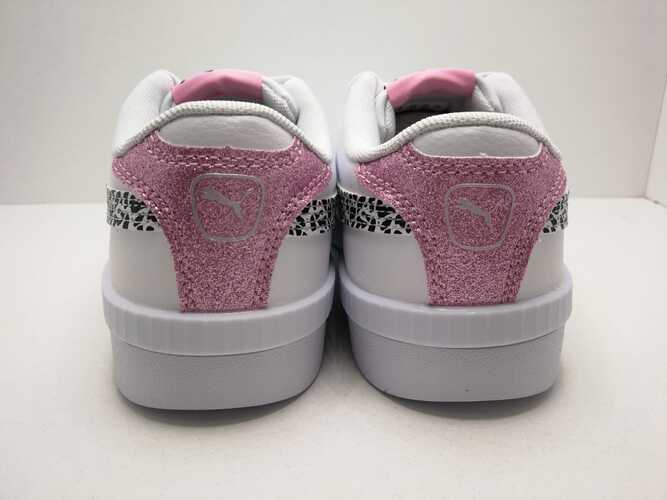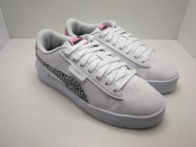 Zapatilla PUMA cordones en color blanco, con estampado animal print en la pipa del costado. Trasero rosa con glitter. Suela plataforma, plantilla soft foam.